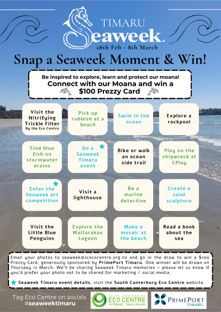 Whether you attend a Seaweek Timaru event or connect with our moana in your own way, simply email us a photo to seaweek@scecocentre.org.nz to go in the draw. You can enter more than once! Each email counts as one entry, so send one photo per email to increase your chances of winning.